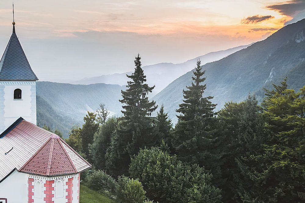 This is a photo of a small and semi-abandoned Slovenian church in a beautiful landscape, photographed during sunset.