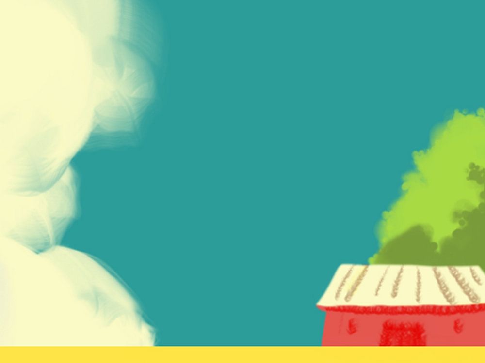 A peaceful minimalist landscape featuring a small red cottage resting between golden fields, soft clouds, and a calm turquoise sky.