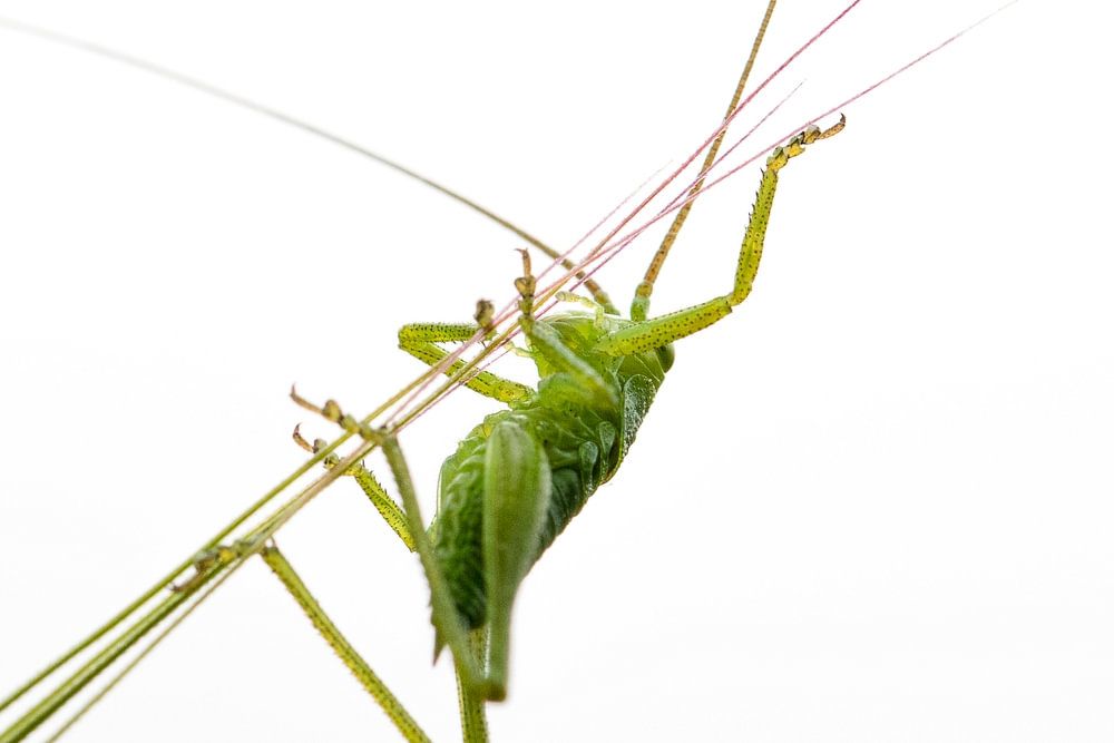 Small sable grasshopper balancing on a blade of grass.