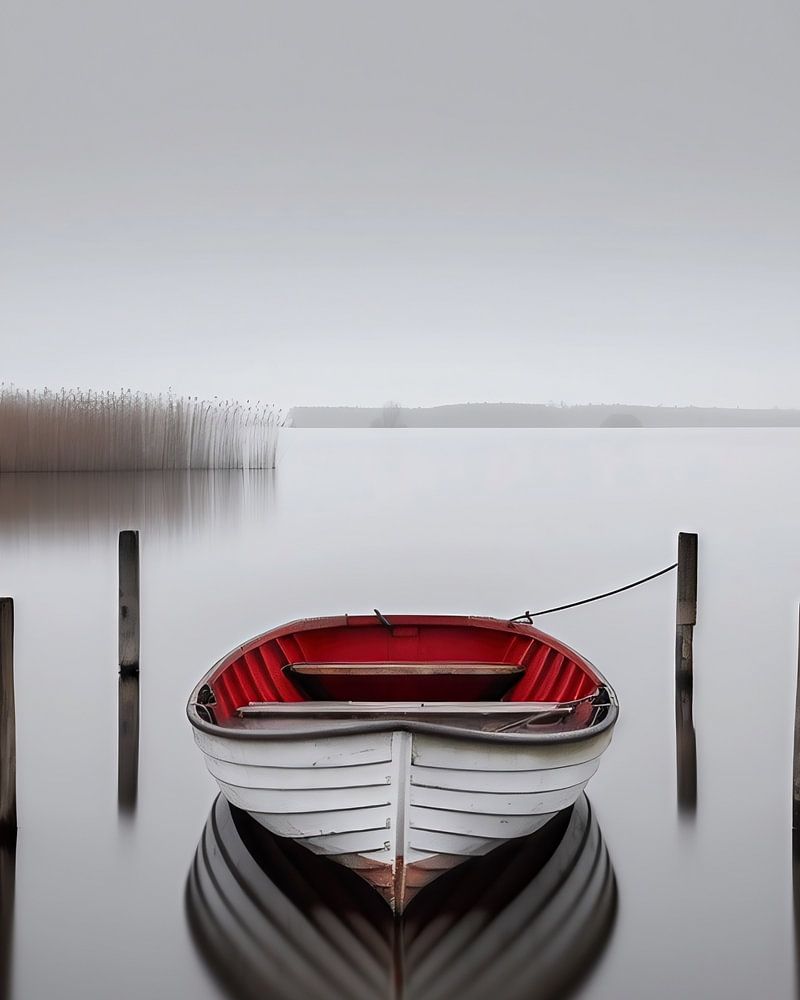 Buy this landscape artwork Small boat, calm lake by fernlichtsicht on canvas, ArtFrame, poster and wallpaper, printed on demand in high quality.