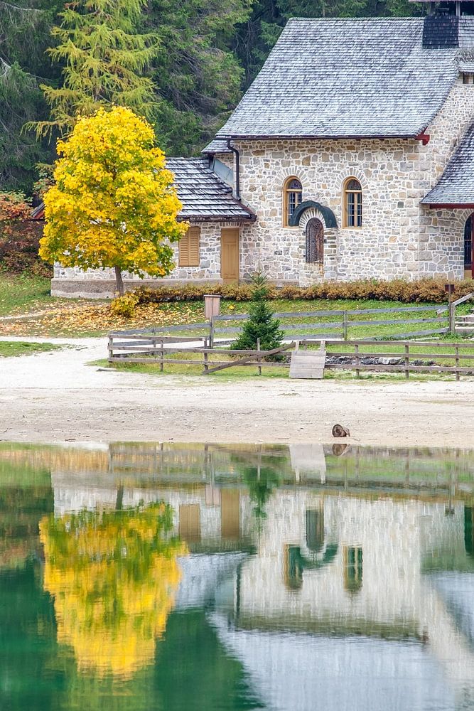 Small chapel at Lake Braies in autumn, South Tyrol by Christian Müringer