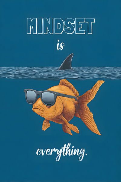 A golden goldfish swims under the surface of the water in a deep blue ocean. It is wearing black sunglasses and a distinctive shark fin, with the words "Mindset is everything" in the picture. The scene combines an underwater world with tongue-in-cheek symbolism.