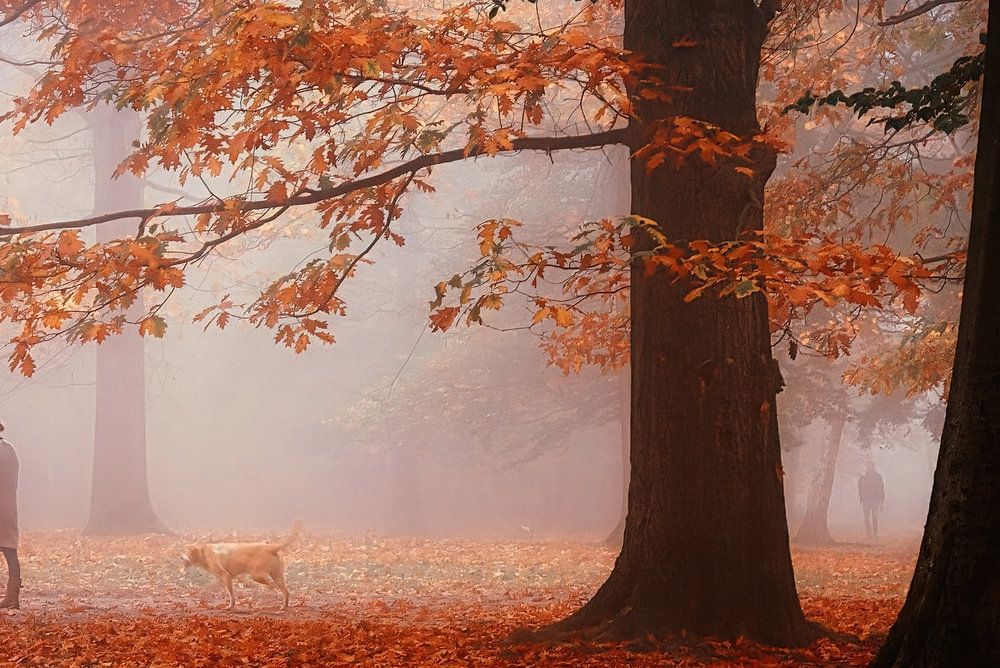 Mysterious, misty autumn photo with passers-by giving a mysterious atmosphere to the story .