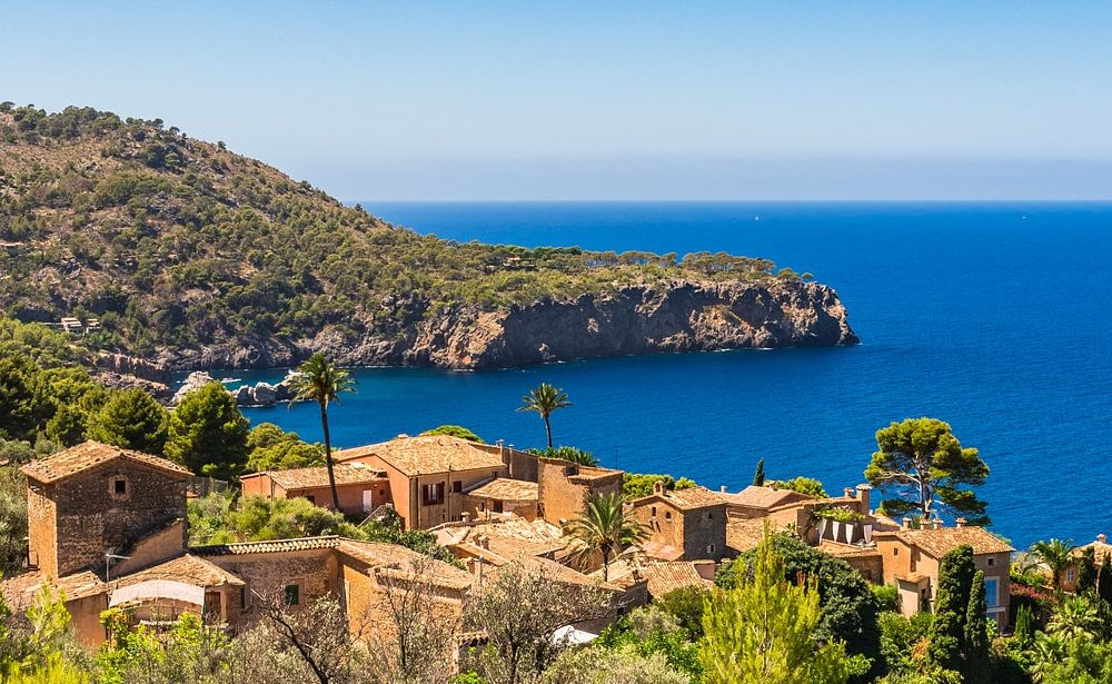 Beautiful island scenery on Majorca, small village at the coast of Deia, Spain Mediterranean Sea