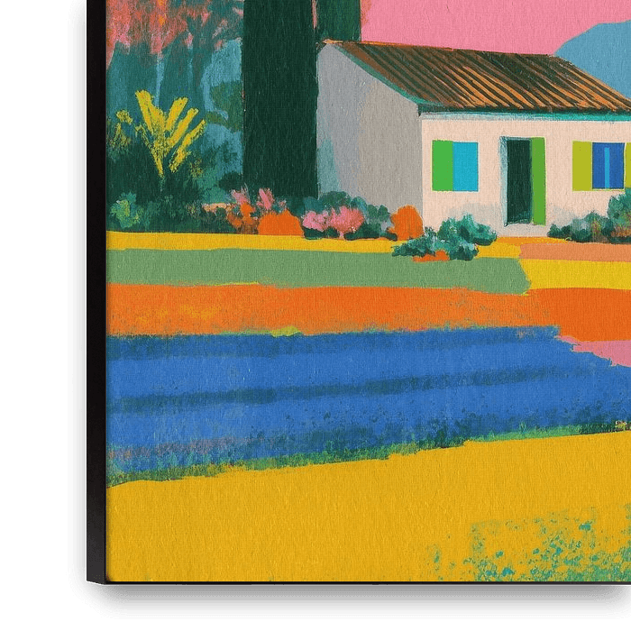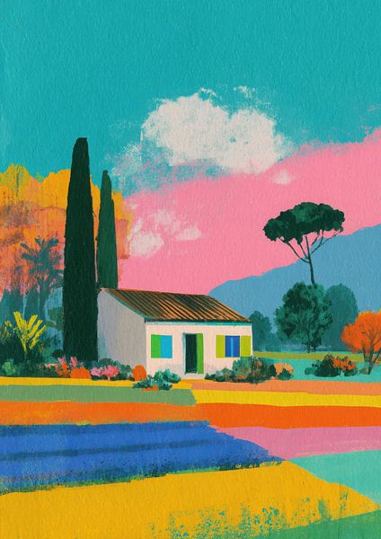 Buy this landscape artwork Small white house in a colourful patchwork landscape by Niklas Maximilian on canvas, ArtFrame, poster and wallpaper, printed on demand in high quality.