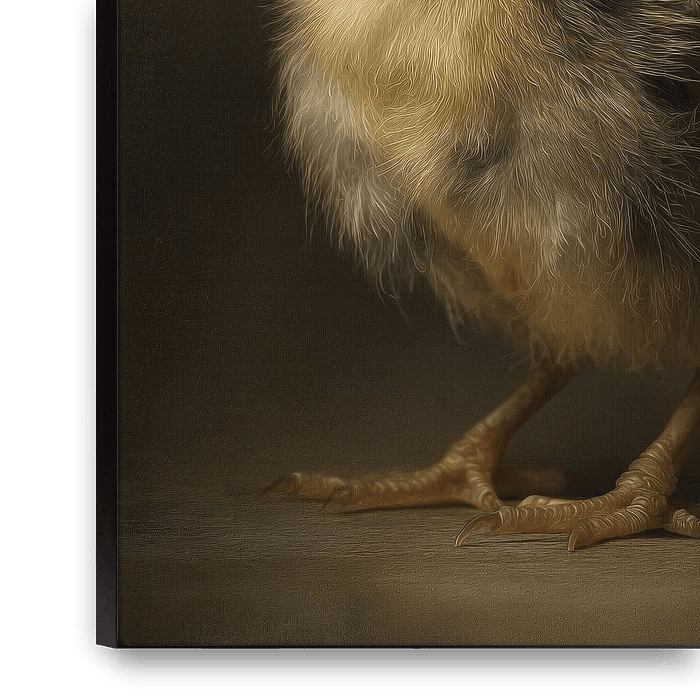 A small chick sits quietly in the picture, its downy feathers almost tangible in their softness. The warm tones and subtle details give the painting a sense of security and vulnerability. A tender portrait that emphasises the purity of new life.