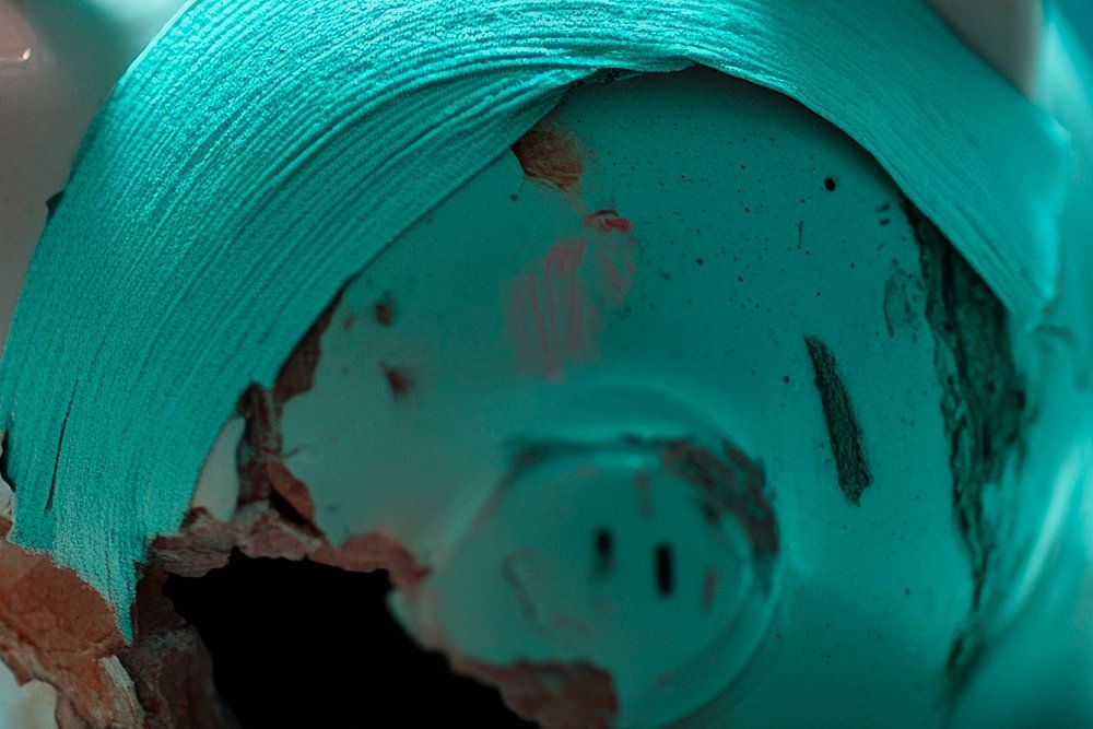 A lost treasure, injured and broken, tells stories from the past. The glamorous sight of shattered dreams and scattered coins lends the room a melancholy note. This special work of art is perfect for the office to remind people of the importance of thrift and wise investment.