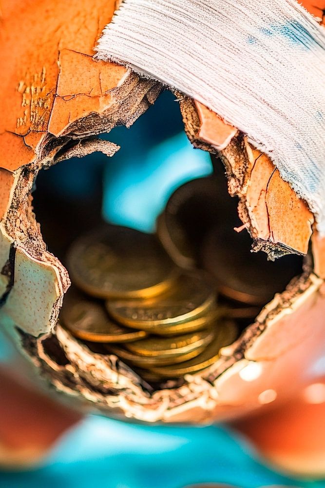 A broken piggy bank with an eye-catching bandaged wound reveals hidden treasures in the form of coins that open up a new world of financial possibilities. This intriguing motif adds a touch of humour to the office and encourages reflection on frugality and financial goals.