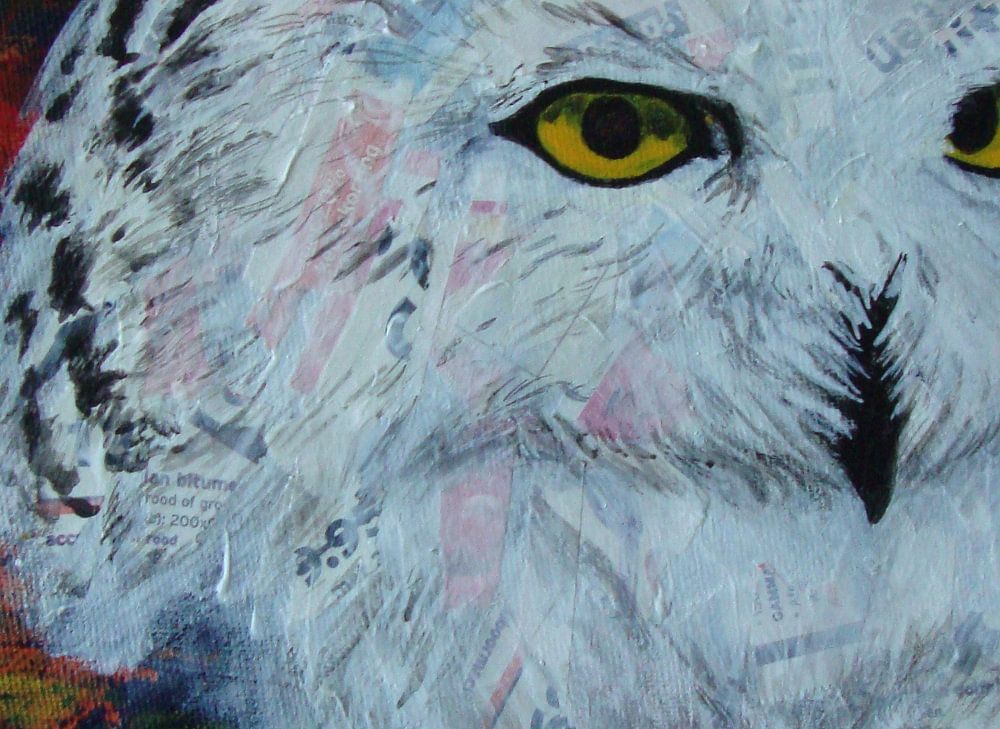 Een dierenportret gemaakt met acrylverf en stukjes krant.Een moderne collage waarbij ook de paletmes aan te pas is gekomen.Abstracte en realistisch.