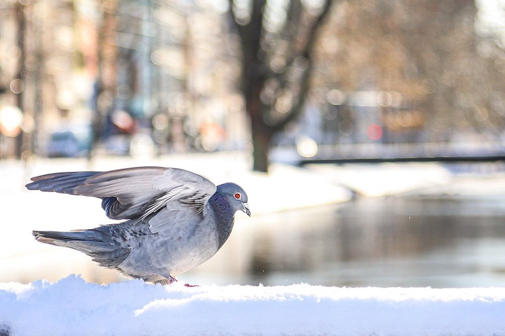 A pigeon in the cold snow in Rotterdam.