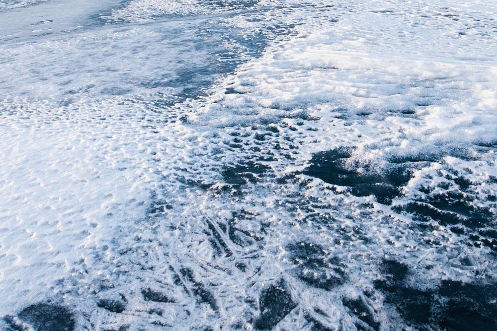 Snow and ice on the flat surface of Lake Baikal under a blue sky in the distance mountain range