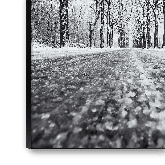 Made during a wintry day. White snow with trees along the road, camera close to the tarmac to emphasise the road. conversion made to black and white