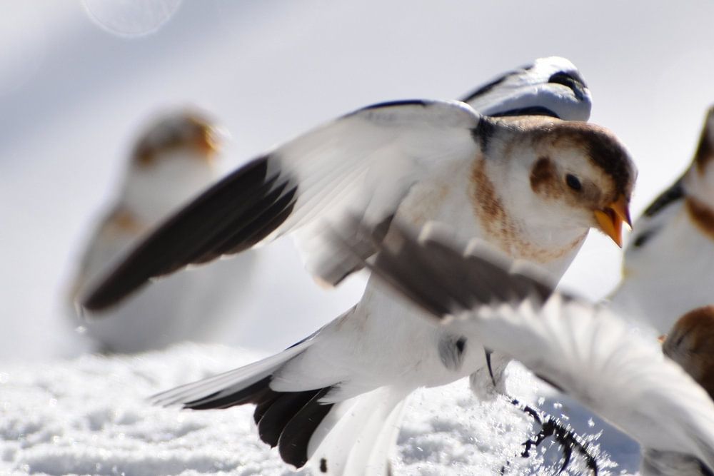 Snow buntings in winter, Sainte-Apolline, Quebec, Canada