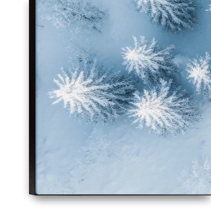 A shimmering winter wonderland unfolds from a bird's eye view. The snow-covered fir trees stand in perfect symmetry, their frosty tops glowing softly in the light. A quiet harmony envelops the scene, while the white splendour transforms the landscape into a dreamlike still life that invites you to linger.