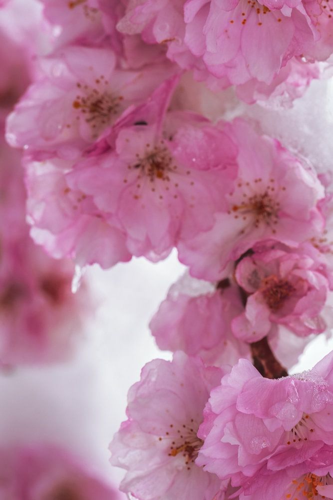 Buy this flower art Snow covered pink cherry blossoms by ManfredFotos on canvas, ArtFrame, poster and wallpaper, printed on demand in high quality.