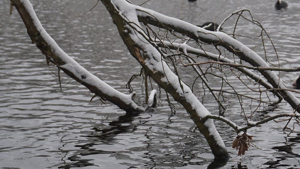 Duck swimming in the pond and a white tree branch with sneew make the photo special.