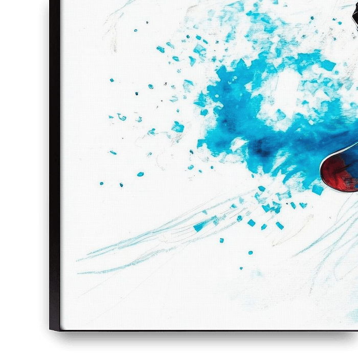 A brave snowboarder cuts powerfully through the wave of snow while bright blue splashes dance around him. In his red outfit, he radiates energy and a sense of adventure as he enjoys the freedom of the snowy mountains. This dynamic scene perfectly captures the feeling of speed and unspoilt winter magic.