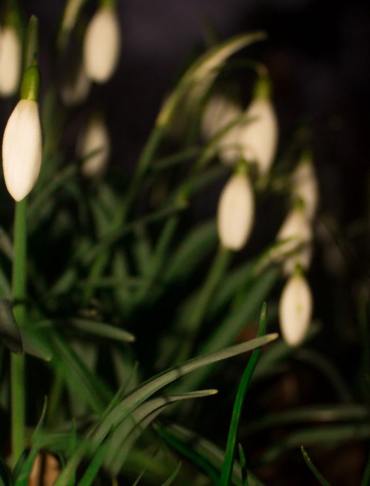 Sleeping snowdrops taken just after sunset when the sky is just a little behind tinted purple, as the picture shows something special.