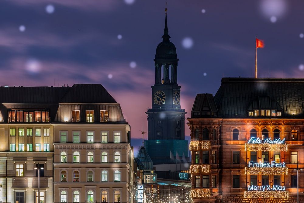 A view of the Christmas market on the Jungfernstieg with the white tents, the fairytale ships on the Alster, the inland lake, the illuminated facades, the brightly lit Alster pavilion, the popular restaurant on the waterfront, and right in the middle, St Michael's Church, our "Michel" at the wonderful Christmas time