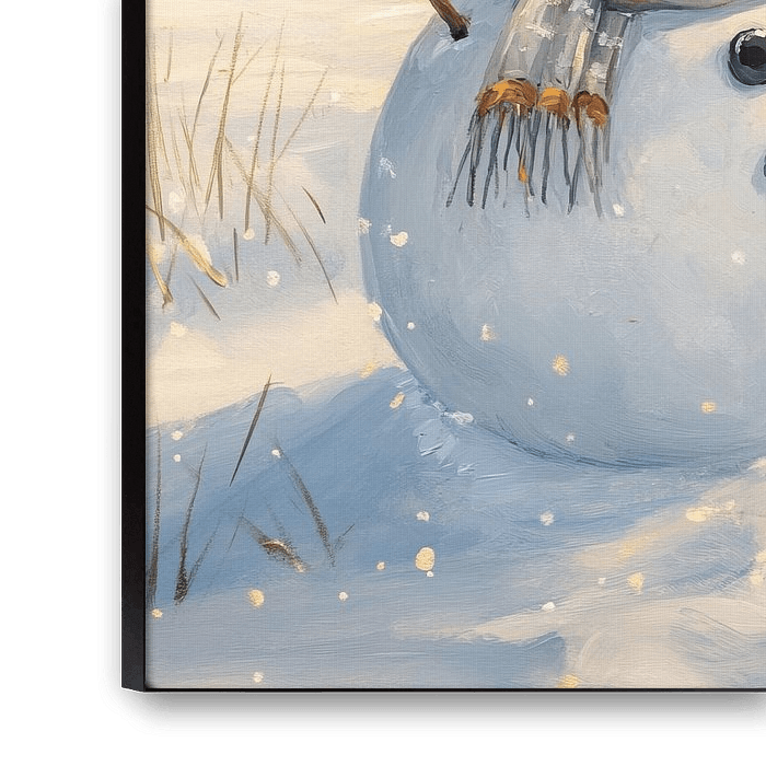 Snowman with Scarf and Hat - This winter painting shows a cheerful snowman wearing a tall black hat and a colourful scarf, surrounded by a soft snowy landscape and golden evening light.