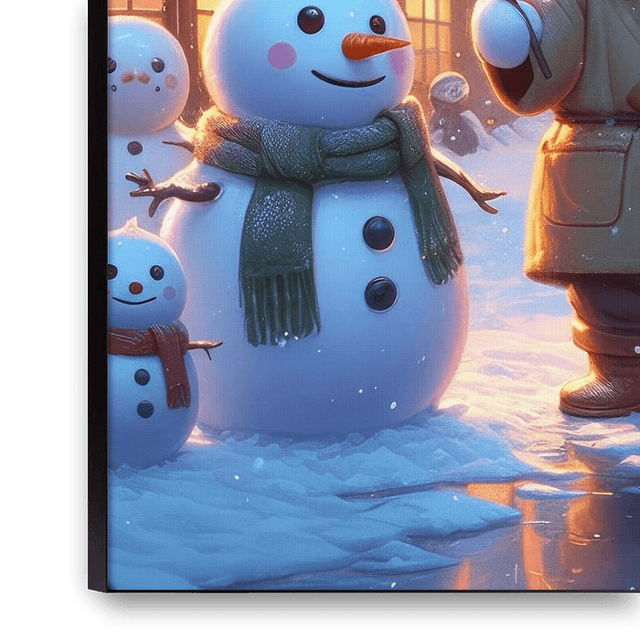A charming, rosy-cheeked snowman, dressed in warm winter clothes, stands proudly amidst a snowy village. He's surrounded by his creations: three adorable snowmen of varying sizes. The warm glow from the village houses illuminates the scene, creating a cozy and festive atmosphere.