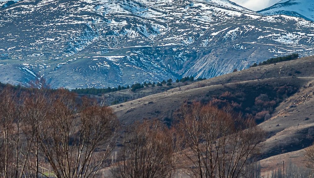 a snowy mountain peak in the middle of a mountain landscape near Suhut.