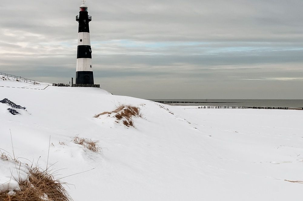 Unique winter image in Zeeuws-Vlaanderen of the Nieuwe Sluis lighthouse in Breskens. It rarely happens that we can admire the black and white cast iron lighthouse in a snowy landscape. The Westerschelde in the background.