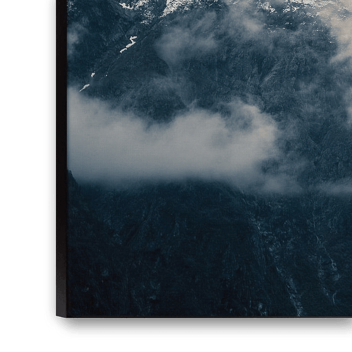 A close-up of rugged snow-capped Norwegian mountain peaks as a storm front approaches. The warm black-and-white conversion creates an abstract image that requires the viewer to look closely before it is clear what can be seen.