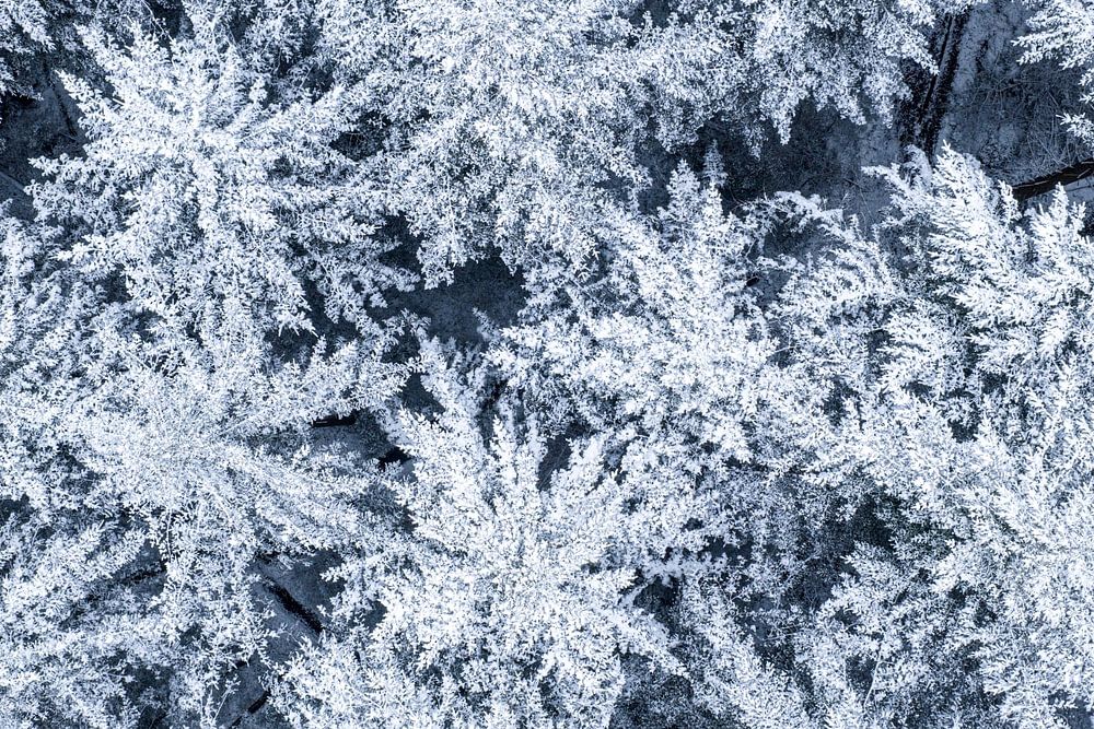 Snowy pine tree forest during springtime seen from above in the Veluwe nature reserve in Gelderland, The Netherlands.