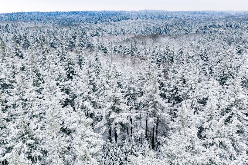 An expansive aerial view captures a dense pine tree forest blanketed in fresh snow during winter in the Veluwe nature reserve, Gelderland province, Netherlands. The scene features evergreen spruce and pine trees…