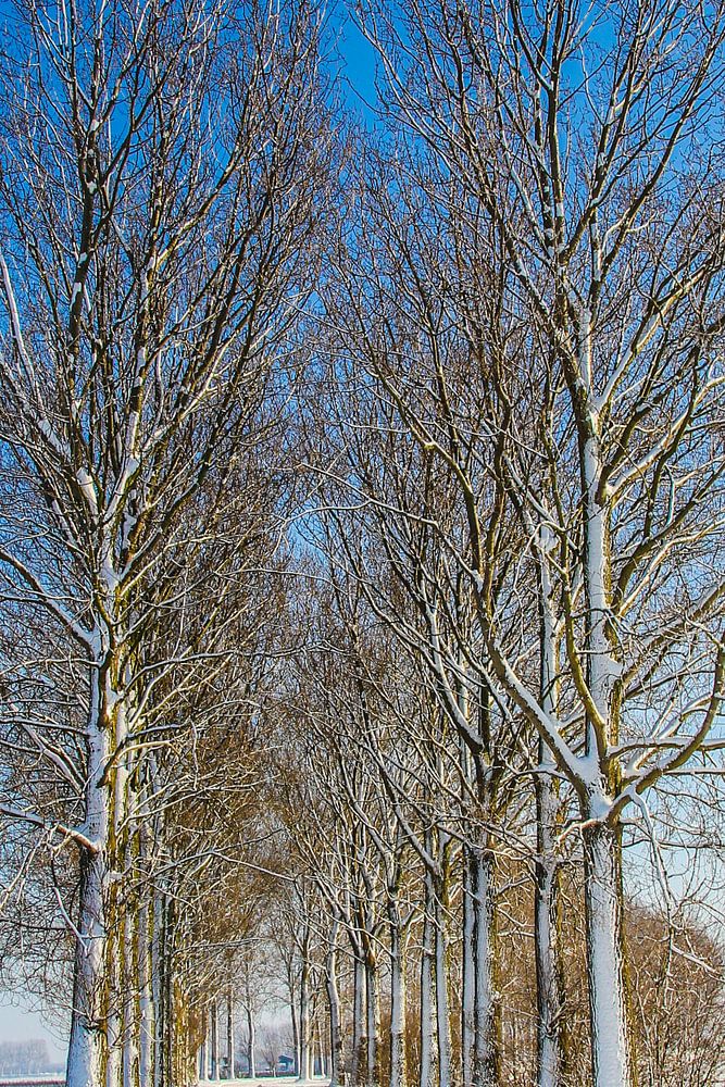 Snowy country road between rows of trees in Zeeland West Flanders, Zeeland