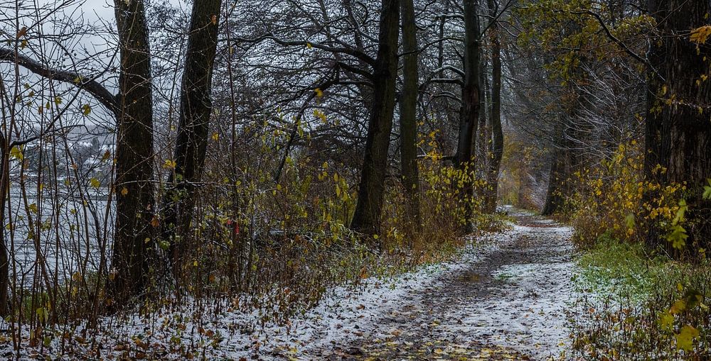 Snowy walkway through trees alley at winter, panorama view by Alex Winter
