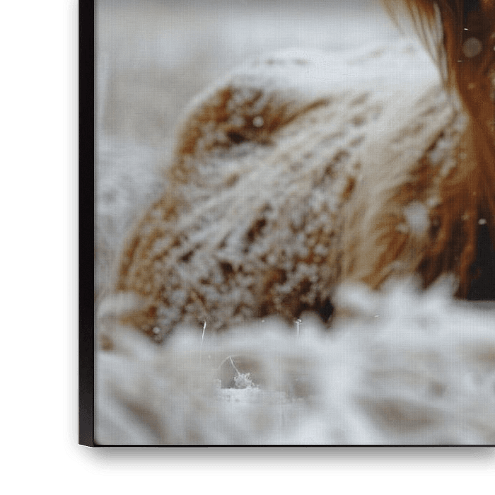 This stunning photograph captures a Highland cow in a picturesque, snowy moment. The icy magic of winter has transformed the animal into a shimmering sculpture, with snowflakes gently landing on its robust coat. The cow's clear eyes penetrate the cold scene, giving it life and captivating the viewer. This artwork exudes the stillness and sublime beauty of a winter's day, bringing the rustic charm of the Highlands right into your home. A perfect piece for anyone who appreciates the impressive power of nature and the unwavering perseverance of its inhabitants.