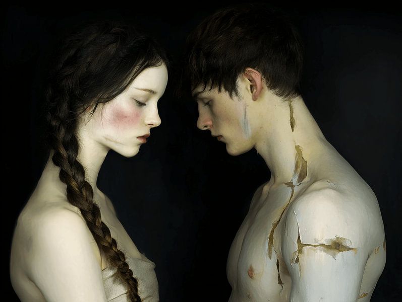 The work has a dark background, almost black, making the two figures stand out like candle flames in a quiet room. Her skin is pale and soft, her hair braided over her shoulder. He is rougher — and on his chest: a…