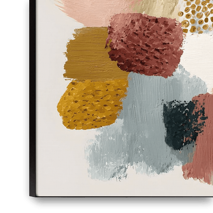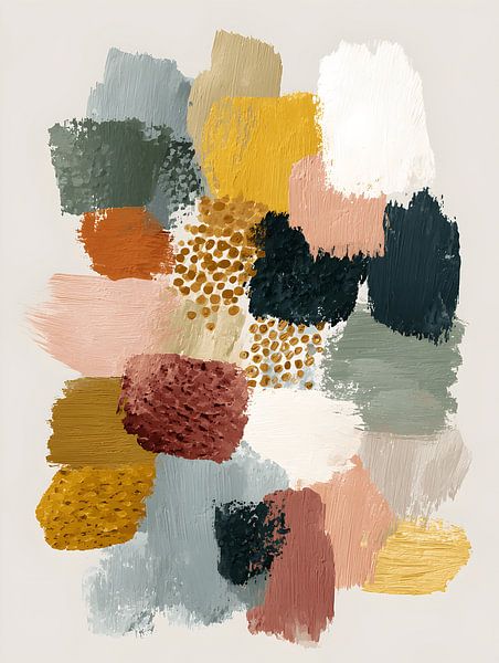 A balanced composition of colour planes in sand, ochre, green and blush. The calm background and paint texture create a timeless look that combines effortlessly with different interior styles.
