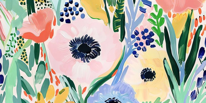This artwork depicts an abstract field of flowers in which colour, form and repetition combine to create a calm yet vibrant whole. Large flower shapes with dark centres are scattered across the image, interspersed with smaller flowers, leaves and loose brushstrokes. The composition is open and balanced, with no clear hierarchy, allowing…
