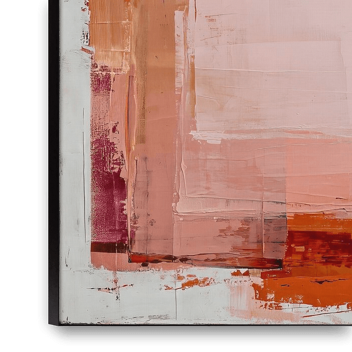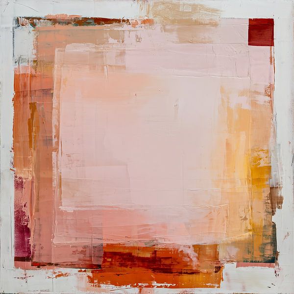 This abstract painting is composed of layered planes in soft peach, sand and warm earth tones. The large central plane radiates tranquillity and openness, while the edges show more tension and movement through visible paint structure and subtle colour differences.