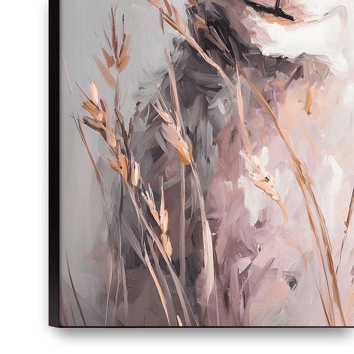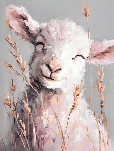 A tender portrait of a lamb among delicate blades of grass. The soft brushstrokes and light colours create a calm, almost comforting atmosphere. Beautiful in a serene living space or children's room.