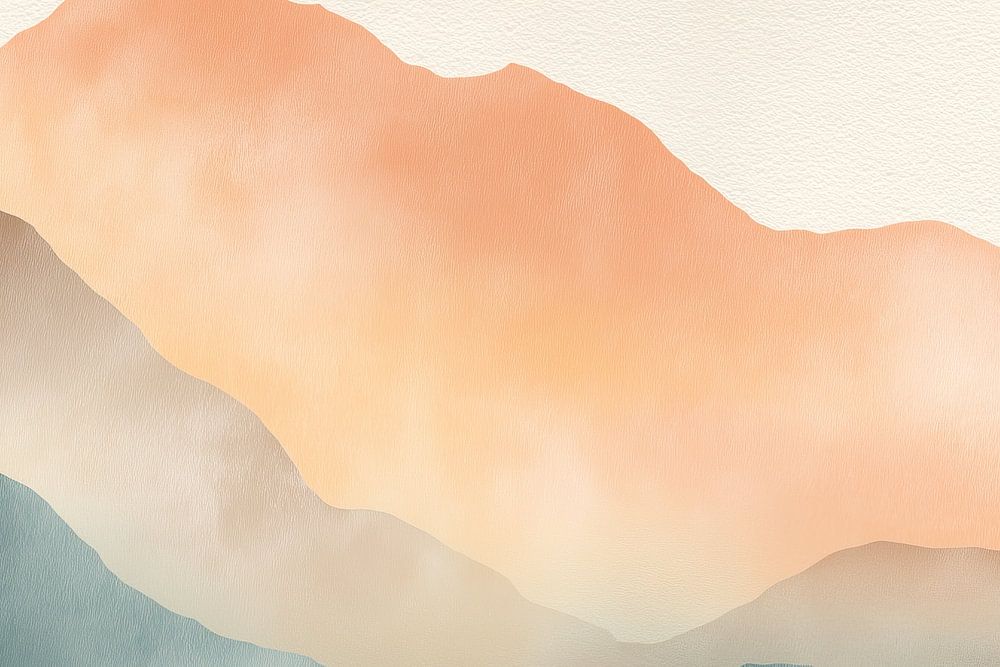 Soft Mountains Horizon is a sophisticated watercolour artwork depicting a minimalist mountain landscape in soft, calming colours. The composition consists of flowing, overlapping mountain shapes, painted in a palette that subtly transitions from light grey to peachy orange. Hints of blue-green appear at the base of the mountains, gradually fading to warmer tones as the eye moves upwards.