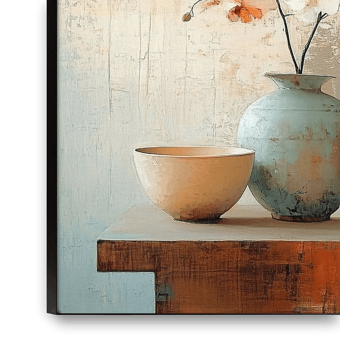Soft Orchid Pause - This floral painting shows a soothing still life of white orchids in a faded turquoise vase, accompanied by an undefined white jug and a simple cream-coloured bowl, all brought together on a sturdy wooden table against a softly textured background in shades of beige and orange.