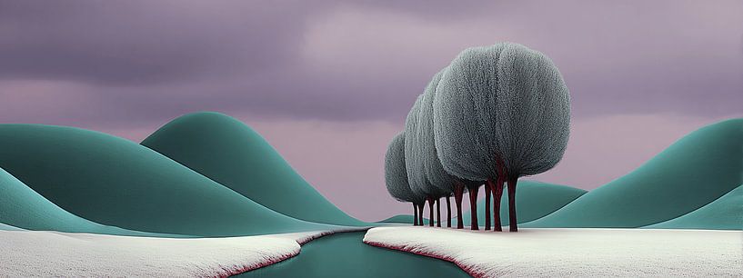Elongated, minimalist landscape with soft green hills, rows of spherical trees and a river between snowfields under a pastel purple sky. This elongated digital painting depicts a minimalist winter landscape in which soft, turquoise-green hills alternate with white snowfields. In the centre, a sleek river winds its way to the horizon,…