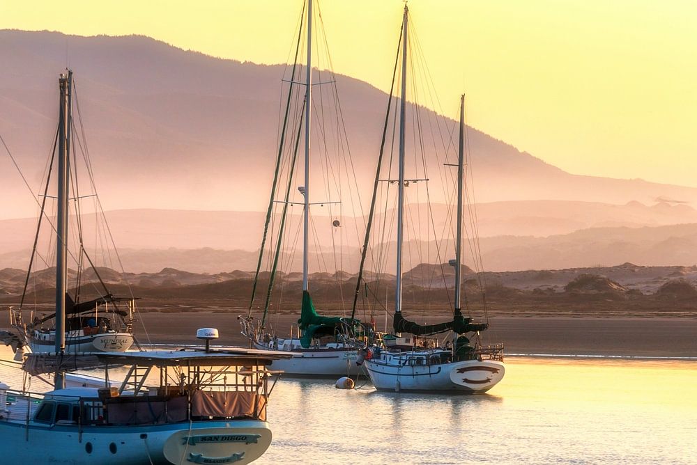 Sailboats are anchored in a tranquil bay at sunset with hills in the background. The soft golden light creates a serene and peaceful scene on the water.