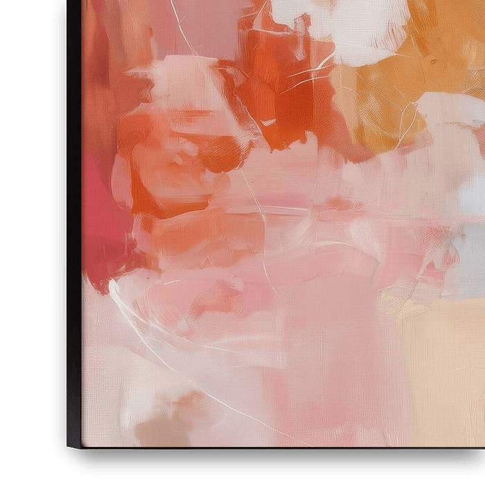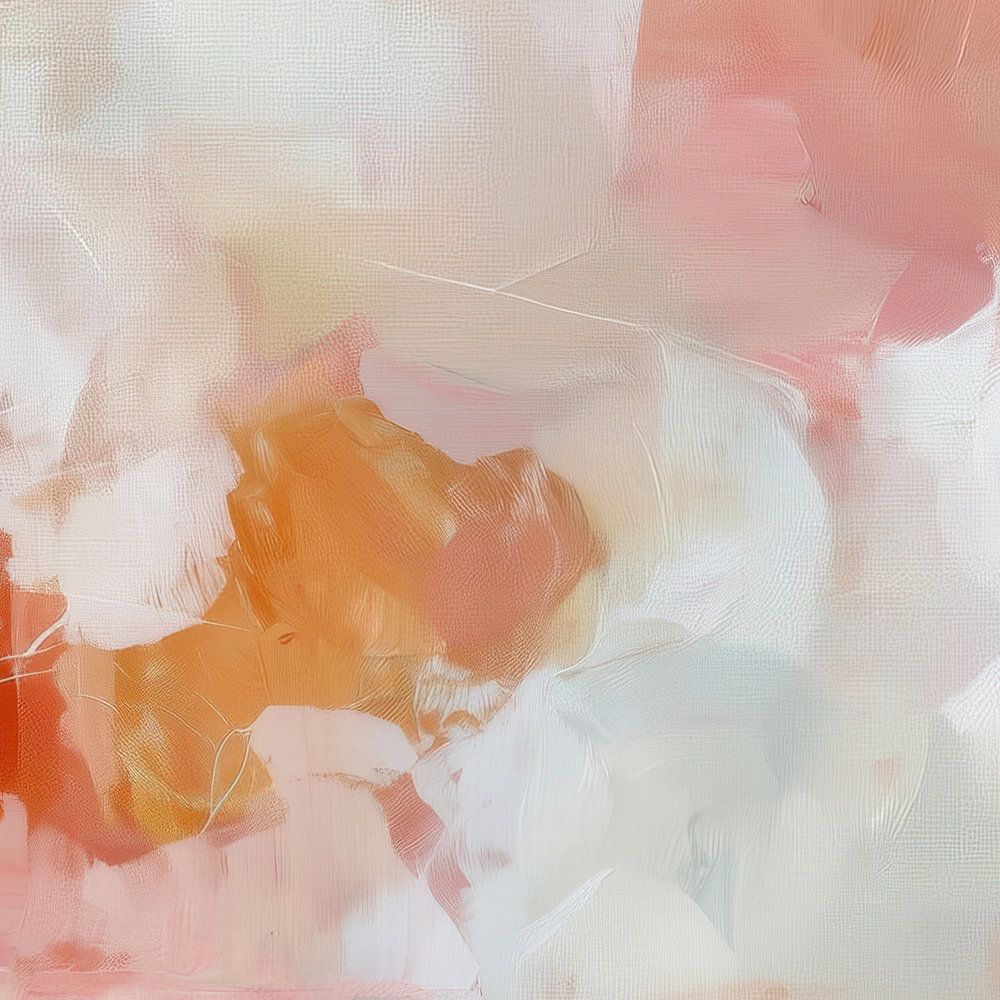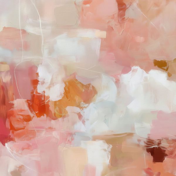 Smooth brushstrokes and a palette of peach, salmon pink, beige and white, complemented by deeper reds and orange-brown accents. The colours mix subtly, as if they blend together like clouds or reflections in water. This gives the composition a dreamy and organic quality.