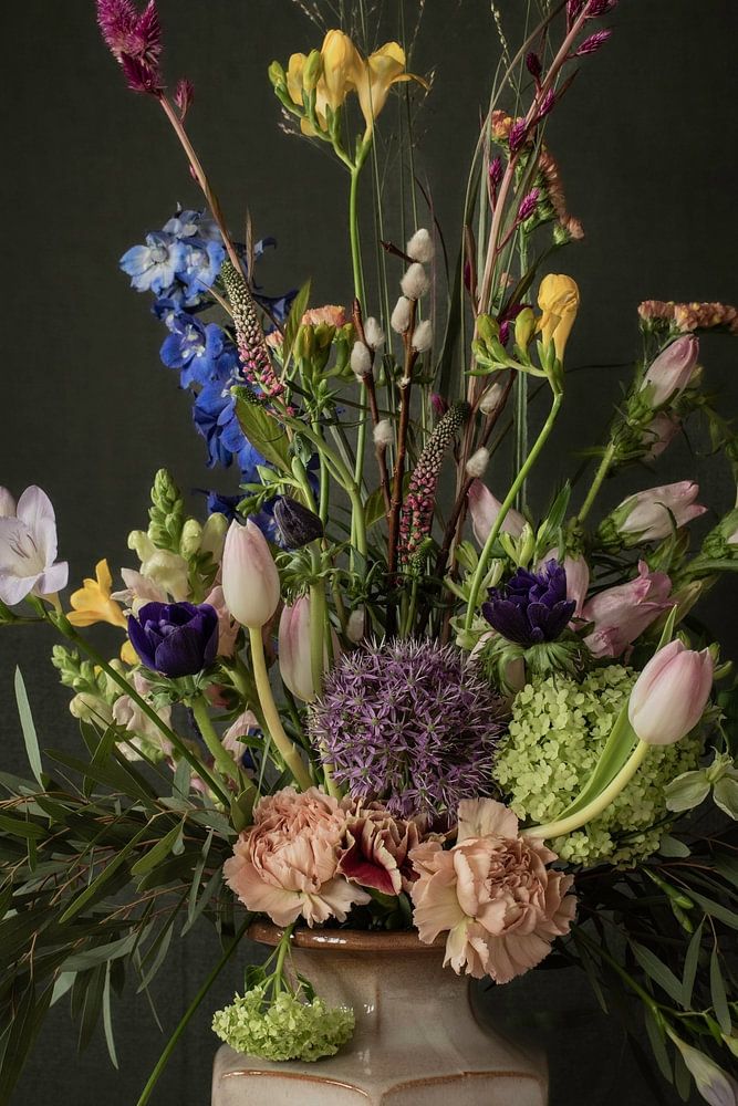A harmonious still life in which colour, texture and symbolism meet. The bouquet in shades of pink, yellow and purple radiates warmth and light. The light earthenware vase is placed on top of two old books. A softly draped canvas lies over the books, giving depth and movement to the composition. The dark background lets the colours and shapes speak in peace. A hushed image full of layers that feels both classic and contemporary.