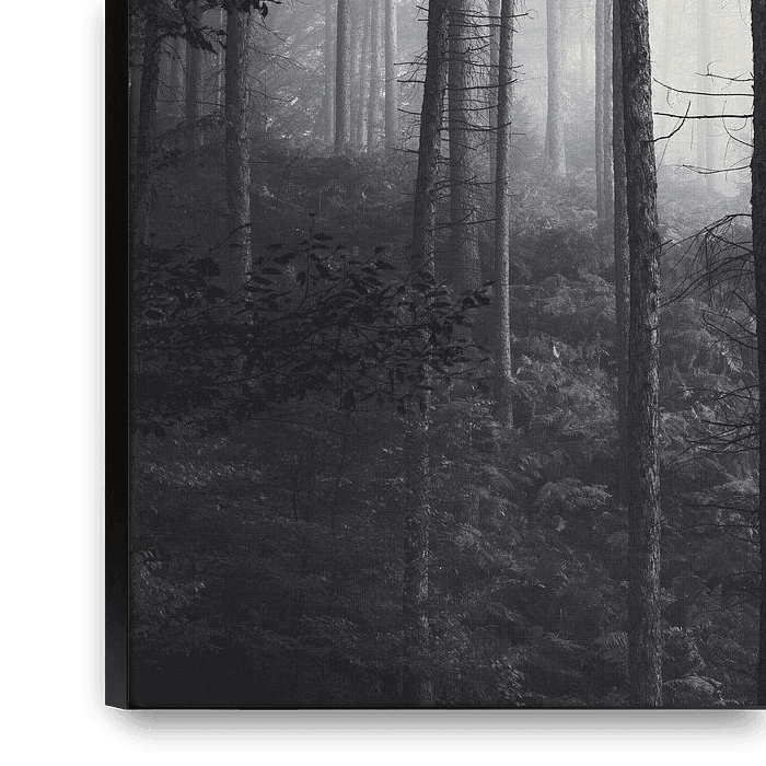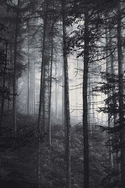 Tall trees stand in a dense forest, shrouded in mist, which lends the scene a mysterious atmosphere. The grey-scale colour palette emphasises the sense of tranquillity and mystery.