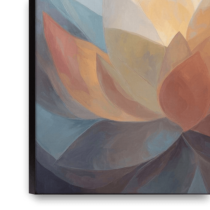 This serene artwork depicts a large lotus flower gently opening in a play of soft colours and light. The flower is composed of many layers of petals that overlap and form a harmonious whole. The colours subtly transition from warm tones such as peach, soft orange and cream to cool blues and soft greens.