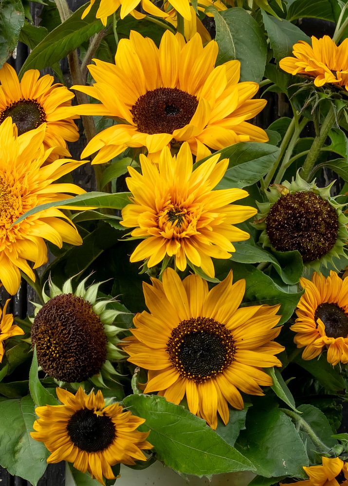 For this one, I was inspired by... idd, Van Gogh. It's the year of Van Gogh, 2024. We have such beautiful sunflowers in the picking garden, I had to do something with them. For this flower arrangement, I picked the 'real' sunflowers, yellow with black, as everyone knows them. I thought it would be nice to make the flower arrangement in this pretty white ceramic pot, in which they stand out beautifully.