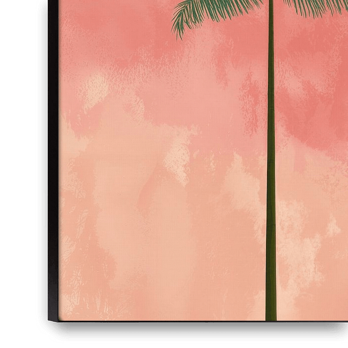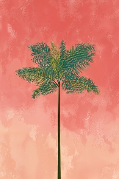 This minimalist artwork features a single, slender palm tree standing tall against a warm, textured background of coral, peach, and soft sunset tones. The composition is simple yet powerful, focusing on balance, calm, and vertical elegance. The palm’s delicate fronds create a gentle contrast against the smooth, atmospheric backdrop,…