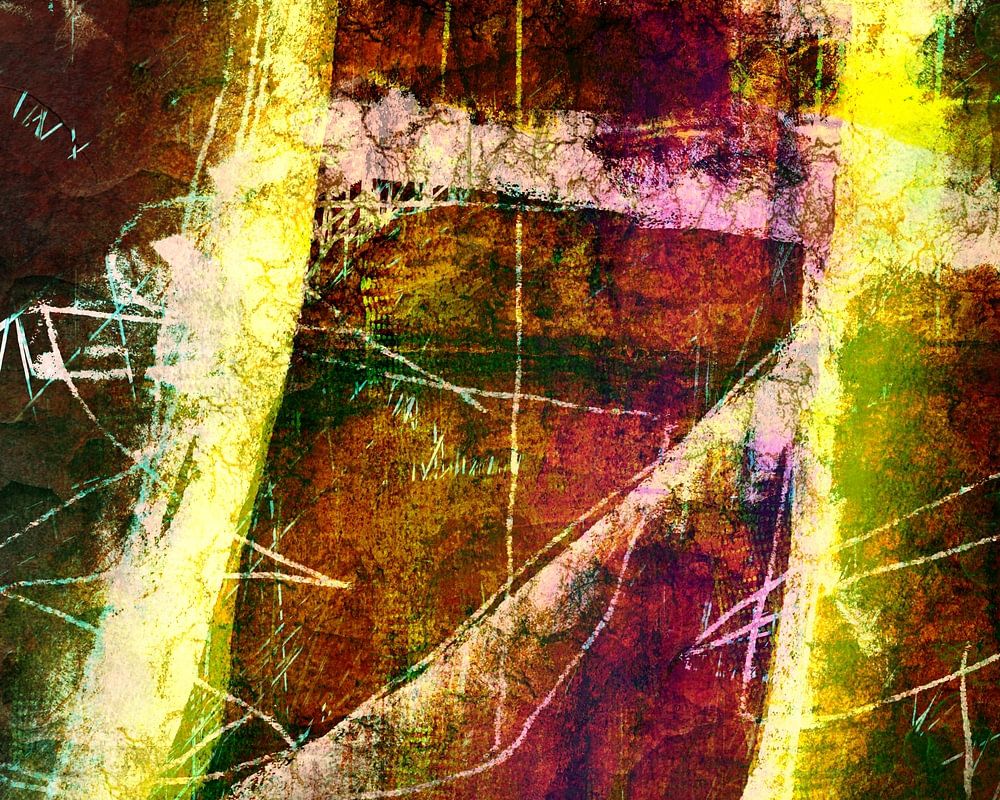Abstract digital painting with vibrant green, red and yellow textures, evoking a complex and captivating landscape.