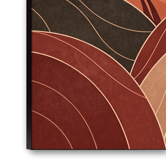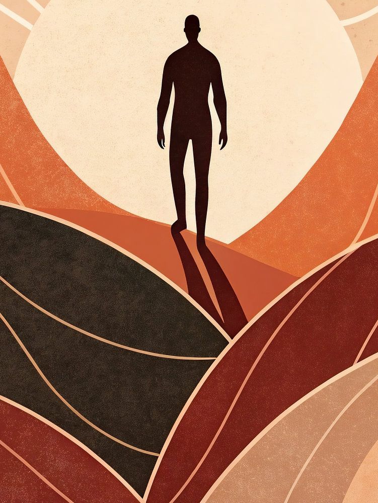 A minimalist yet evocative wall art featuring a lone silhouette standing amidst warm, abstract hills under a rising sun. The flowing lines and earthy tones of terracotta, ochre, and deep brown create a sense of peace, self-reflection, and connection with nature. Perfect for modern interiors seeking warmth and calm energy, this artwork celebrates mindfulness and the quiet beauty of new beginnings.